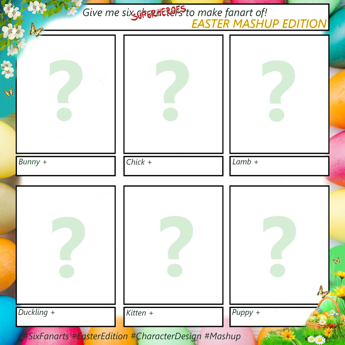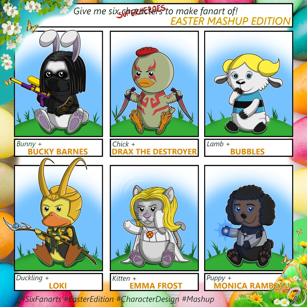 My Character #Mashup Challenge - #Easter edition! I'll draw six #babyanimals as #superheroes, randomly chosen from your suggestions. So, who are your favourite superheroes? #digitalart #drawing #fanart #characterdesign #artchallenge #sixfanarts #easteredition #grdilicious #grdi