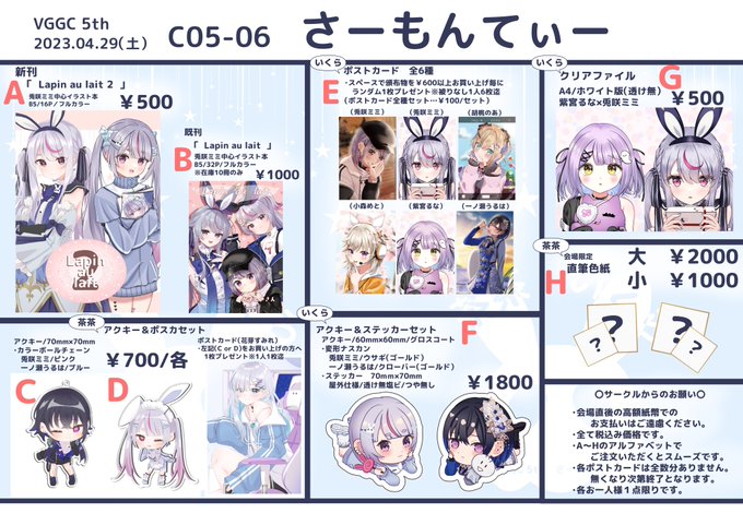 VGGC5thにいくらさん(@ animalanimal17)と サークルで参加します😎売り子にさくをみさん(@ Vsakusakupoyo)が来てくれます! みみたやメインのイラスト本やアクキーなどを頒布予定です! 是非遊びに来て下さい〜🙏 #VGGC