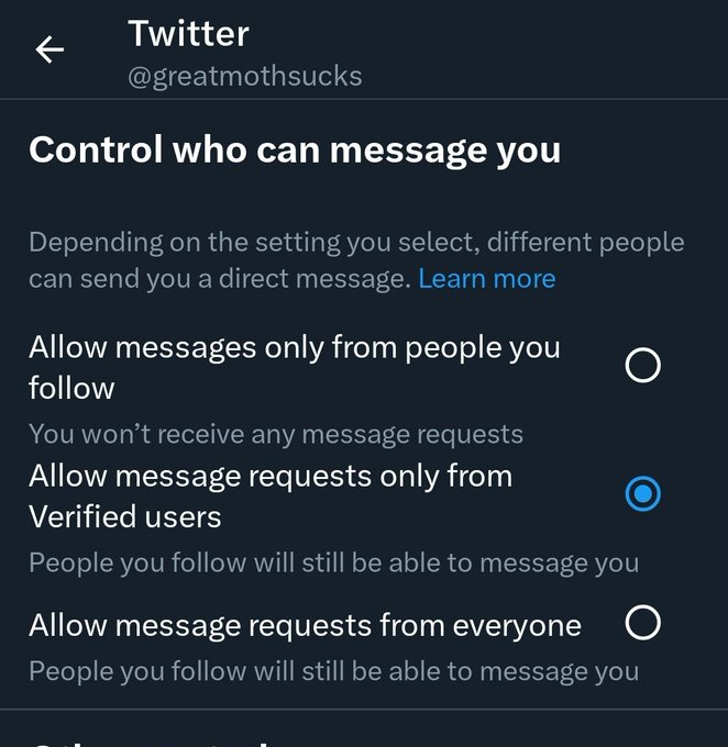 Today I woke up to learn the messaging system was changed and was automatically put here where I'm only allowed message requests from Twitter blue suckers. Remember to go into privacy and safety to change this if you need to have message requests open like me