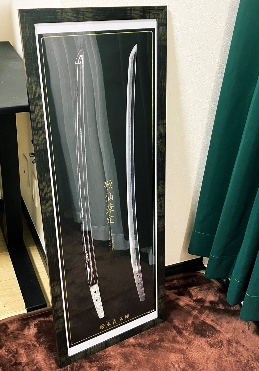 歌仙兼定ポスター、サイズがイレギュラーでどう飾るか悩んでたけど、 手ぬぐい額縁に入れるとちょうど良かった