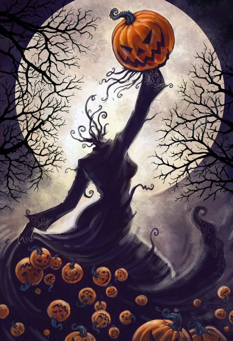 Jill-O'-Lantern! Day 4! The Pumpkin Queen danced in the pale moonlight as her pumpkin horde filled her grisly garden! #digitalart #digital #art #artwork #artist #artober #drawlloween #draw #drawing #drawlloween2022 #inktober2022 #photoshop #halloween #october #jillolantern #fall