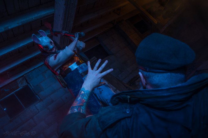 Throwback to this amazing shoot done by mastermind @AnnieGravesCos since it's their bday today Huntress: @QuelsieCosplay Bill Overbeck: @grimsage99 @DeadByBHVR #DeadbyDaylight#cosplay#MementoMori