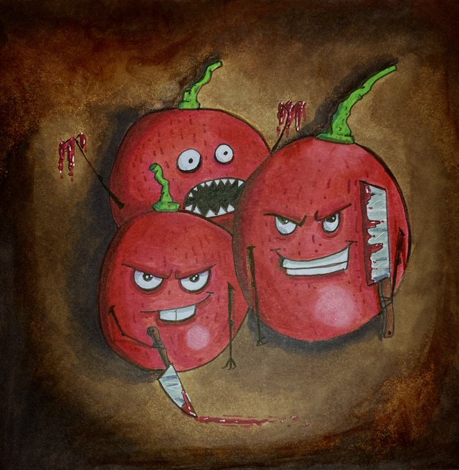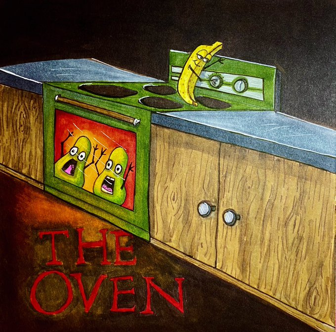 The pears were warned… too late now. I mean it’s not the end of the world, probably. #inktober2020 #inktober #illustration #cartoon #theomen #oven #bakedpears #halloween #horror #theomen #prismacolormarkers #poscapens #horrorart