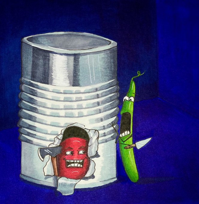 It’s The Tinning! Jack’s been canned way, way too long. Relatable… #lockdown #inktober2020 #inktober #horror #theshining #jacktorrance #illustration #cartoon #prismacolormarkers #poscapens #ink #tincan #vegetarian #tomato #stringbean