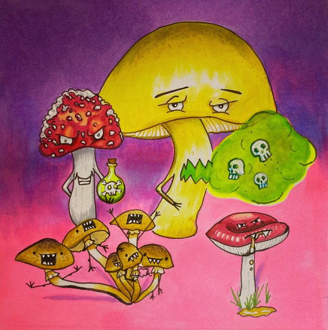 Frankly poison ☠️ mushrooms are just rude. #inktober2020 #inktober #poison #mushrooms #terror #gross #psychedelic #deadly #illustration #cartoon #vegan #inkdrawing #sauteedmushrooms #prismacolormarkers #poscapens