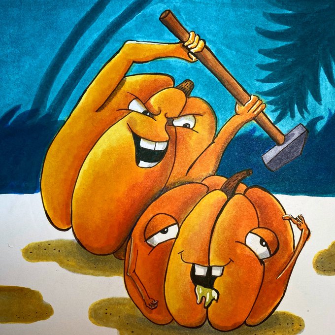 You need to be more specific when you request Smashing Pumpkins from the DJ 90s kids. #inktober #inktober2021 #primacolormarkers #sakuramicronpens #pumpkin #badproduce #smash #smashingpumpkins #violence
