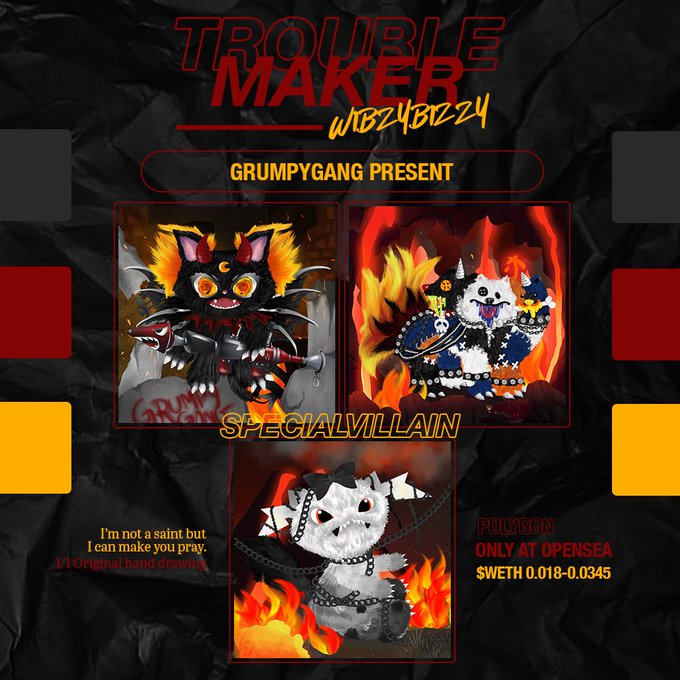 🏁 WIBZYBIZZY❤️🔥 『Imaginary friends created by childhood traumas』 ♡ Trouble Maker。@opensea Prices : O.O123 - O.O345 $ETH (POLYGON) opensea.io/collection/wib… #NFTthai #NFT #nftart #NFTJapan #nftcollector #NFTCommunity #NFTCollection #art #Polygon #opensea #digitalart