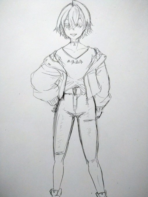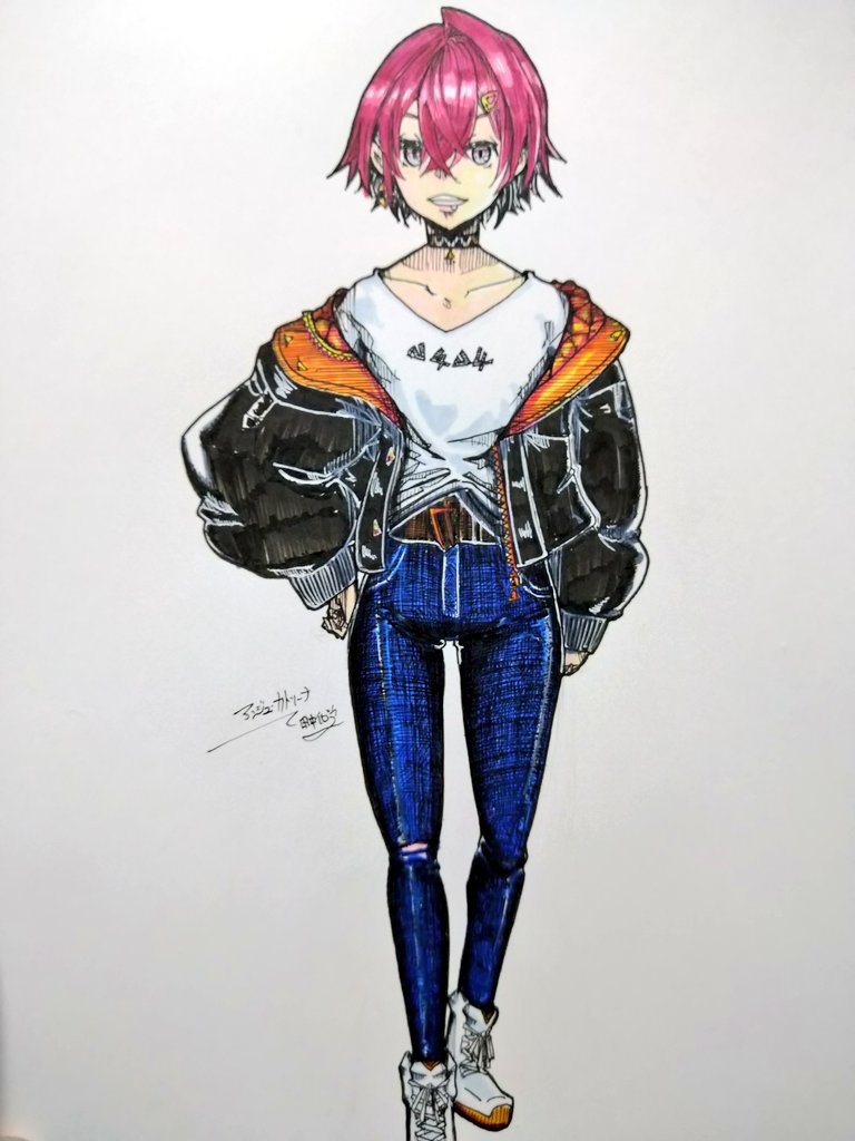 #絵ンジュ #アンジュ新衣装 よし!アンジュ新衣装全体図完成! 久しぶりにモノクロでジーンズ描いたから超疲れた。でもそのかいあってカッコよく描けたから満足や! 次はもう一つのお嬢様アンジュの新衣装描くべかな!