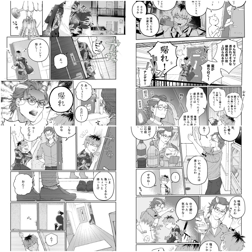 『うしろ』 グミ貴族(@gummy_ymym) 【作品傾向】マンガ 【含】血、負傷表現、動物の死 仕事帰りの🎋が👨🏫の家を訪ねる話です #hpmi_horror100 poipiku.com/831411/4976657…