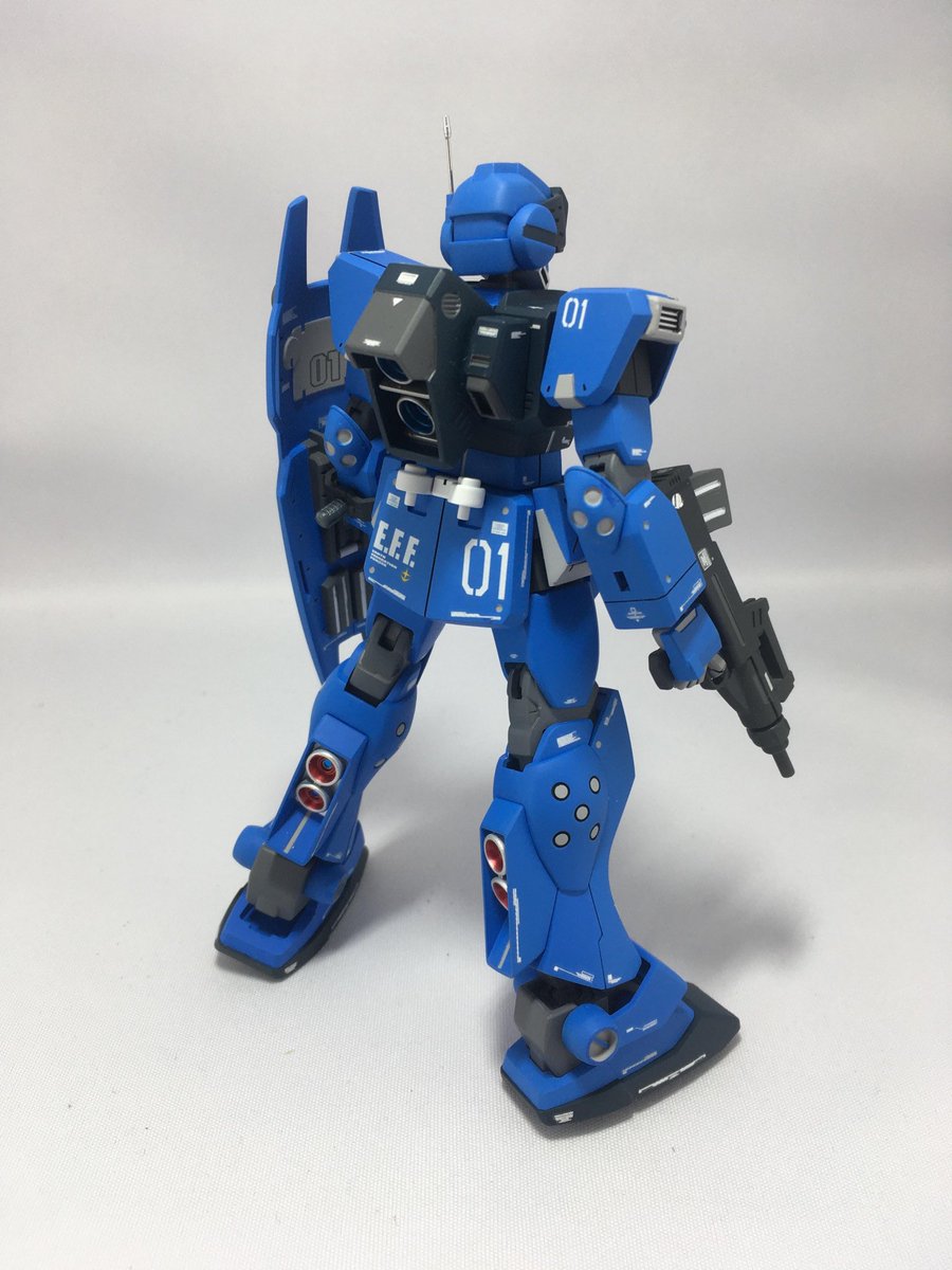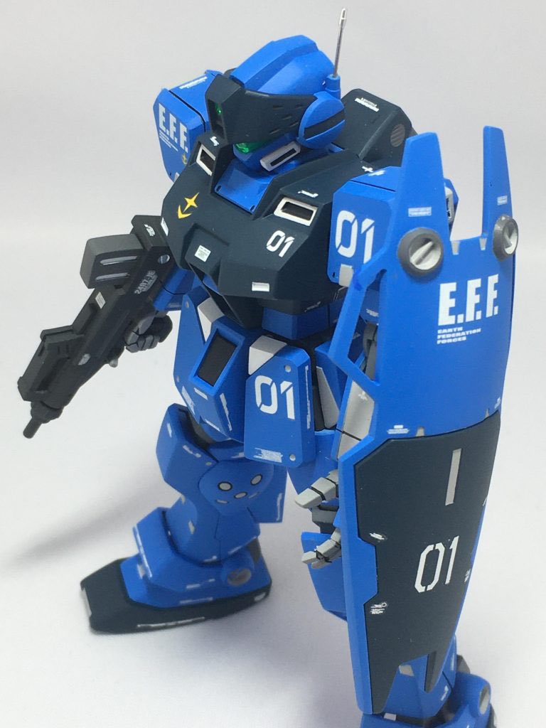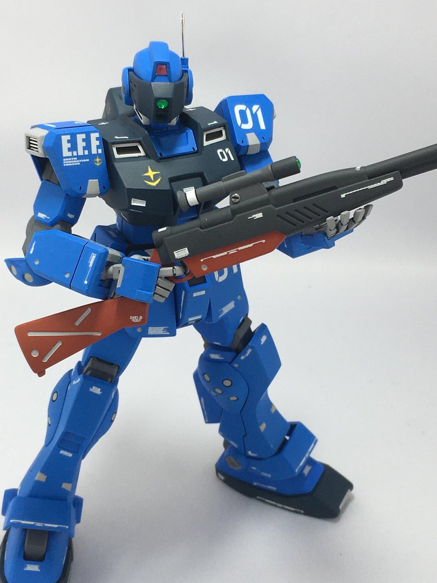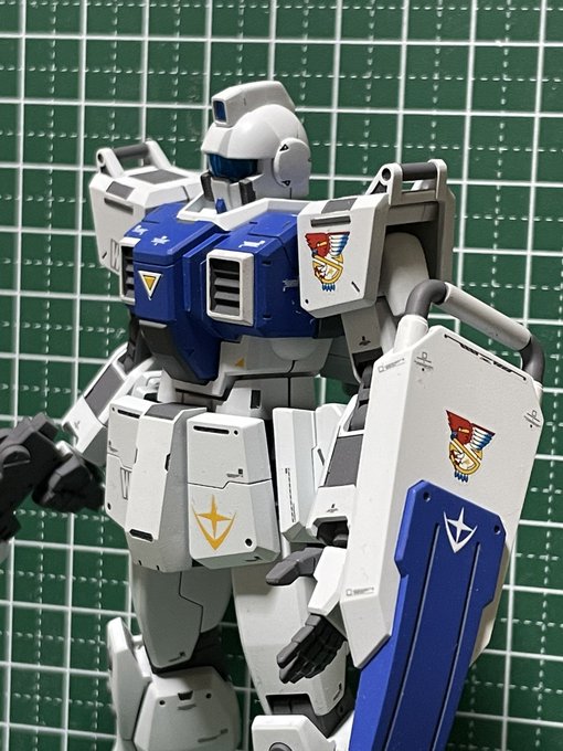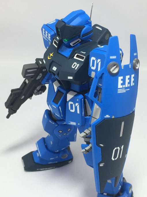 RGM-79[G]スレッガー専用陸戦型ジム 青の塗料に「フィニッシャーズ」の「ブライトブルー」+「ピュアホワイト」 「ブライトブルー」単色だととても濃い青色として発色するので、「ピュアホワイト」を加えて若干マイルドに調整 #ガンプラの画像貼るとRTされると聞いて #ジム #陸戦型ジム