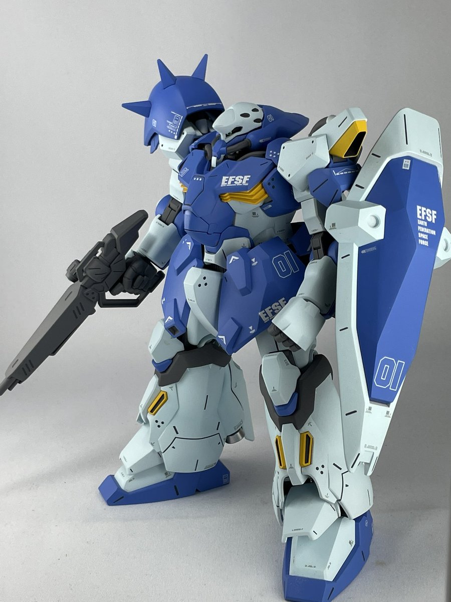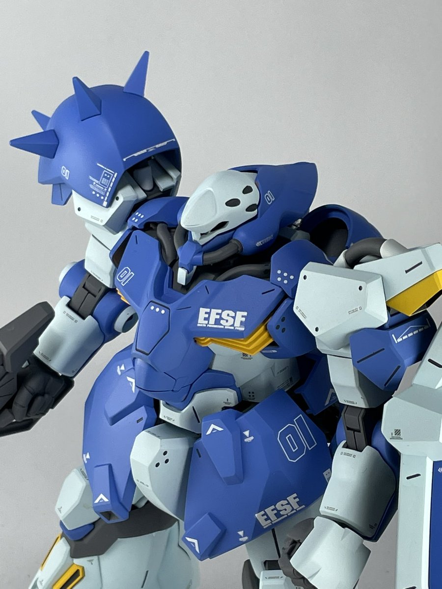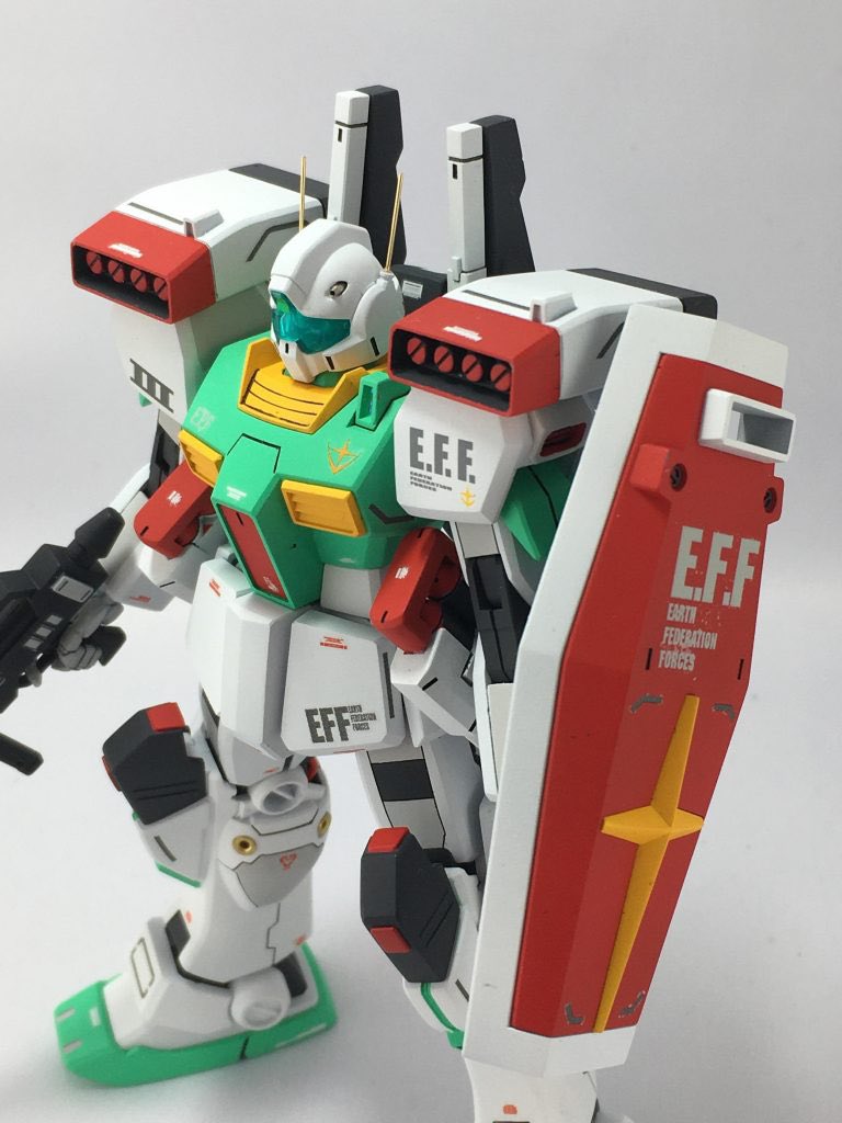 RGM-79[G]スレッガー専用陸戦型ジム 青の塗料に「フィニッシャーズ」の「ブライトブルー」+「ピュアホワイト」 「ブライトブルー」単色だととても濃い青色として発色するので、「ピュアホワイト」を加えて若干マイルドに調整 #ガンプラの画像貼るとRTされると聞いて #ジム #陸戦型ジム