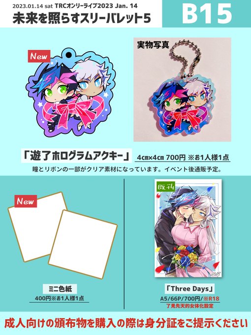 1/14 未来を照らすスリーバレット6 夕暮れカルパス【B15】のお品書きです🙇♂️ 新刊はありませんがグッズとミニ色紙と既刊(女体化本)を持っていきます ミニ色紙は2枚目の画像の4点で既刊以外はお1人様1点になります よろしくお願いします! pixiv.net/artworks/10438…