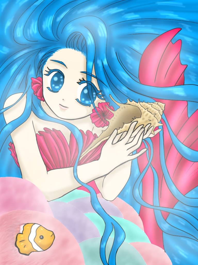 暑くなってきたので海をテーマに、人魚とイソギンチャクから顔を出すクマノミちゃんを描きました🎵 #イラスト #アイビスペイント #人魚 #マーメイド #クマノミ