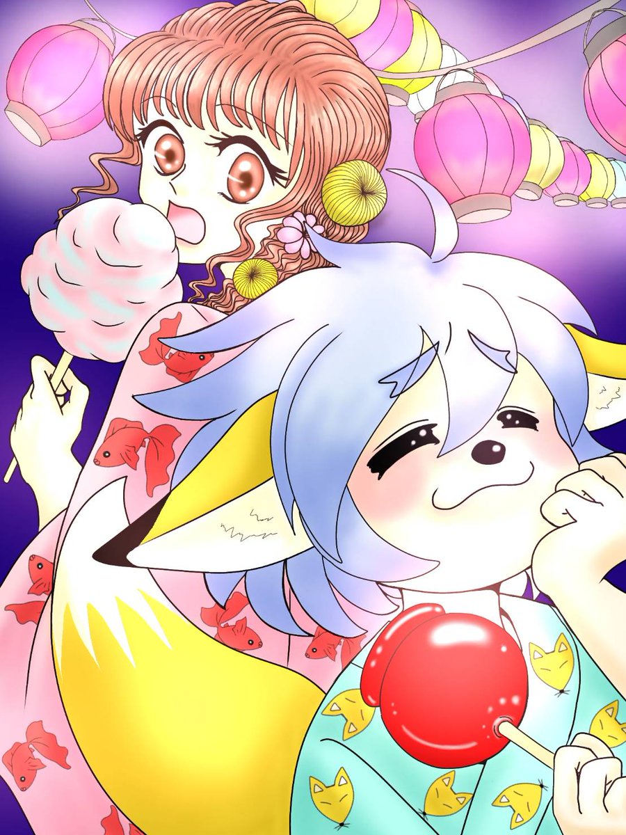 2 7 早くお祭りが出来る世の中になるといいですね!😊 #アイビスペイント #イラスト #夏 #祭り #狐 #りんご飴 #わたあめ #浴衣 21/08/12 17:31