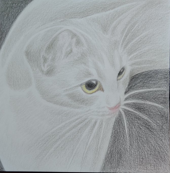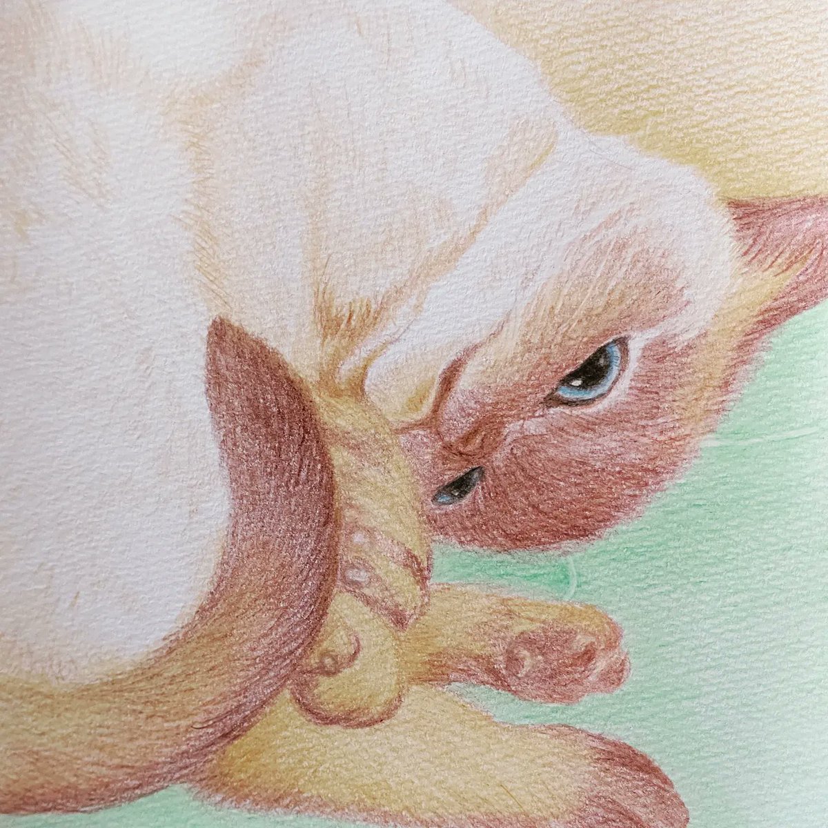 眠たいながらも、こちらを気にする猫ちゃんを描きました😺 #色鉛筆画 #イラスト #猫 #ねこ #もふもふ #cat #猫好きさんと繋がりがりたい