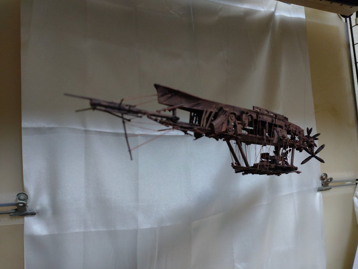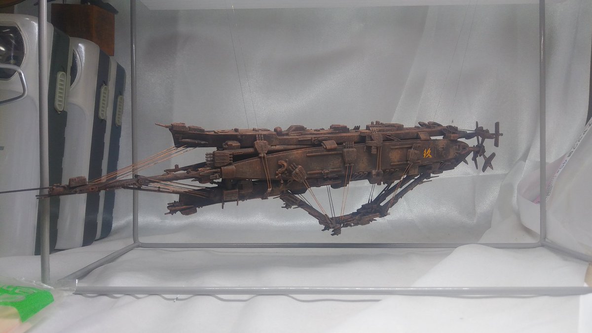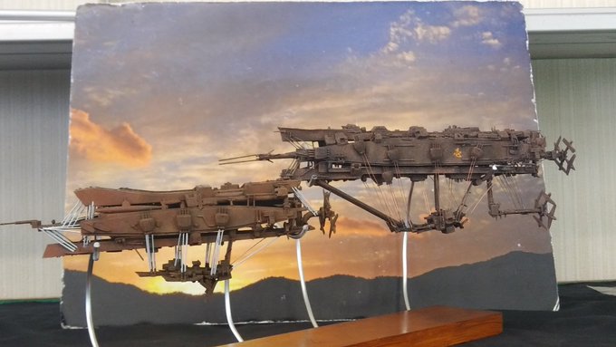 #今月作ったプラモ晒そうぜ アオシマ1/700陽炎ニコイチ組み替えで作った飛行船です(画像後ろ)🙂 つくろーぜ会にて夕陽のパネルがあったのでお借りしました🙌 ファイナルファンタジーⅥの「仲間を求めて」の脳内再生余裕だわね😉