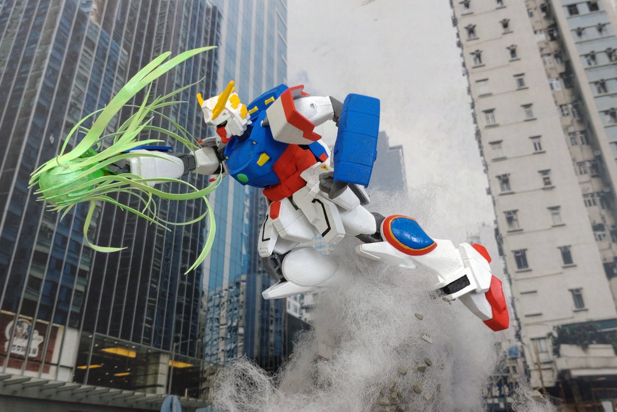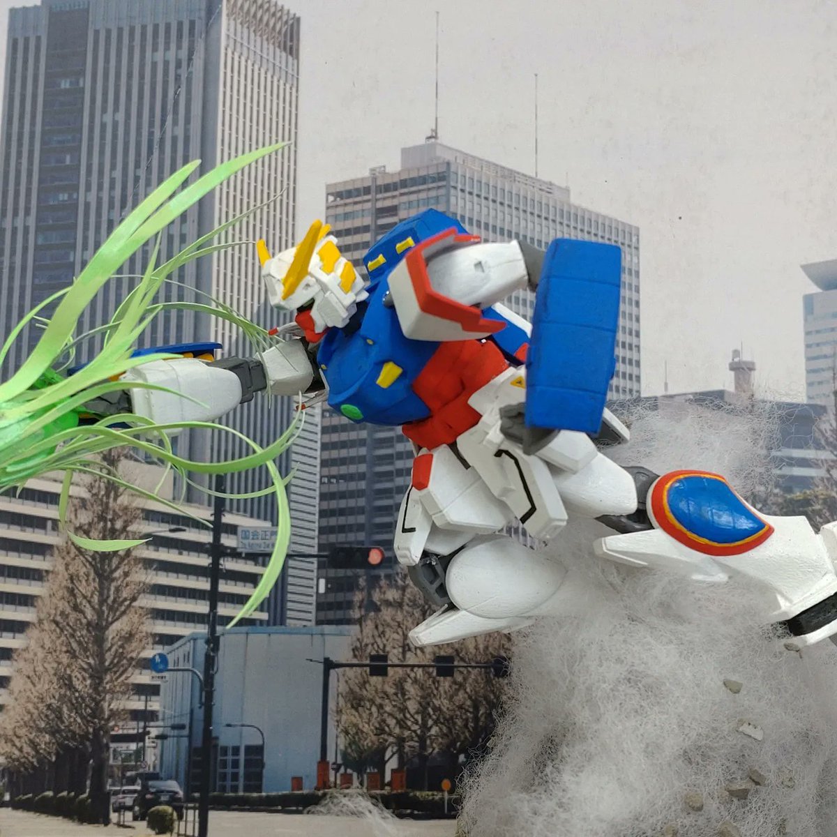 #今月作ったプラモ晒そうぜ 今月は旧キットシャイニングガンダムです🤯 EGガンダムとのミキシング固定ポーズ作品になります🥳 つくろーぜ会でパネルをお借りして撮影 支持棒隠すのに手芸わたをヘアスプレーで固めたものを使い瓦礫はセメント片接着。他にも色々やりました😳