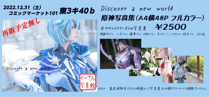 コミックマーケット101土曜東キ40bで頒布させて頂きます。新刊で再販予定はありません。 おまけとして未収録ポストカード3枚セットプレゼント。無くなり次第ポストカードは終了とさせて頂きます。 BOOTH Discover a new world (原神写真集) 通販分も予約受付してます guten5713.booth.pm/items/4330906 #C101