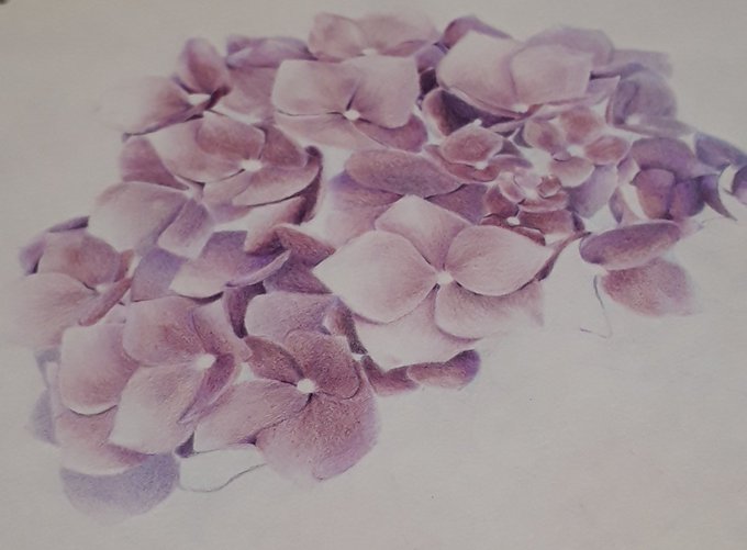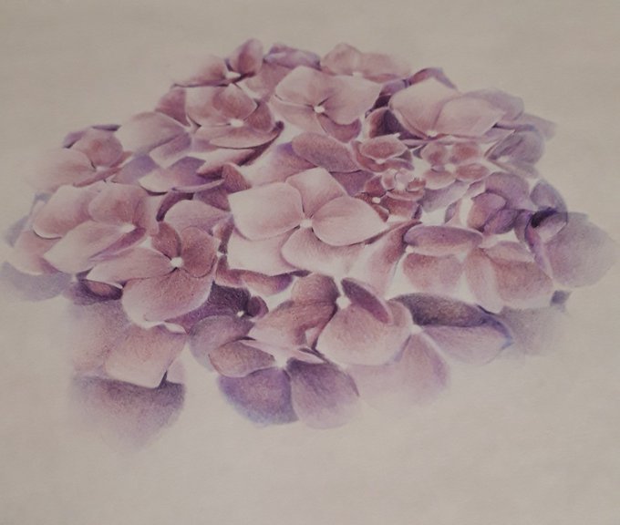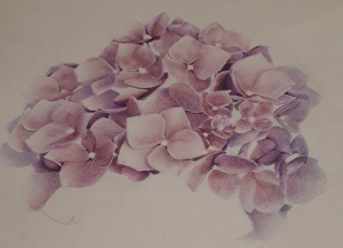0 1 色鉛筆で紫陽花 線描くと変になるんじゃないか不安 #色鉛筆画 22/04/25 02:23