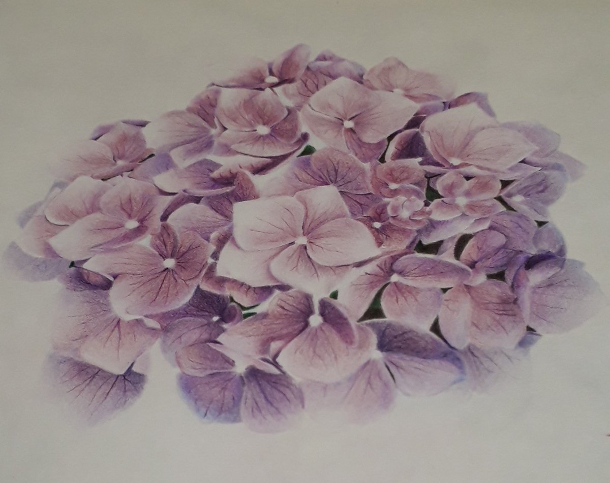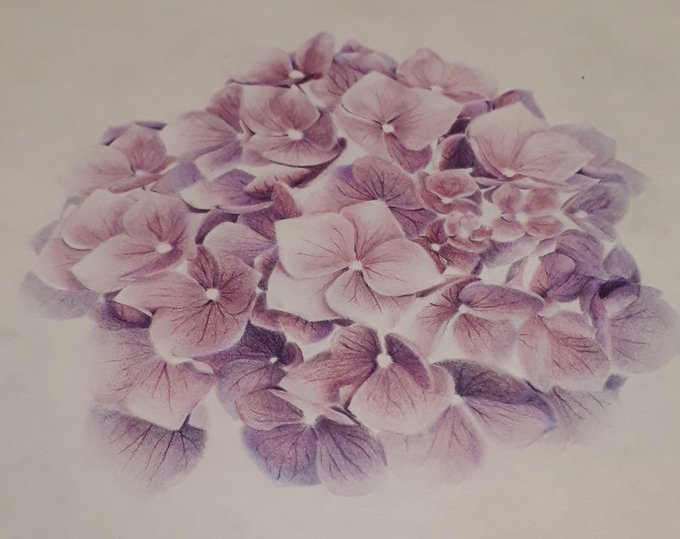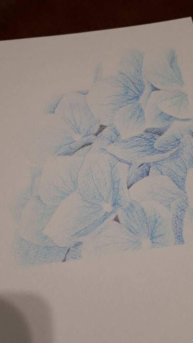 色鉛筆で紫陽花 線描くと変になるんじゃないか不安 #色鉛筆画