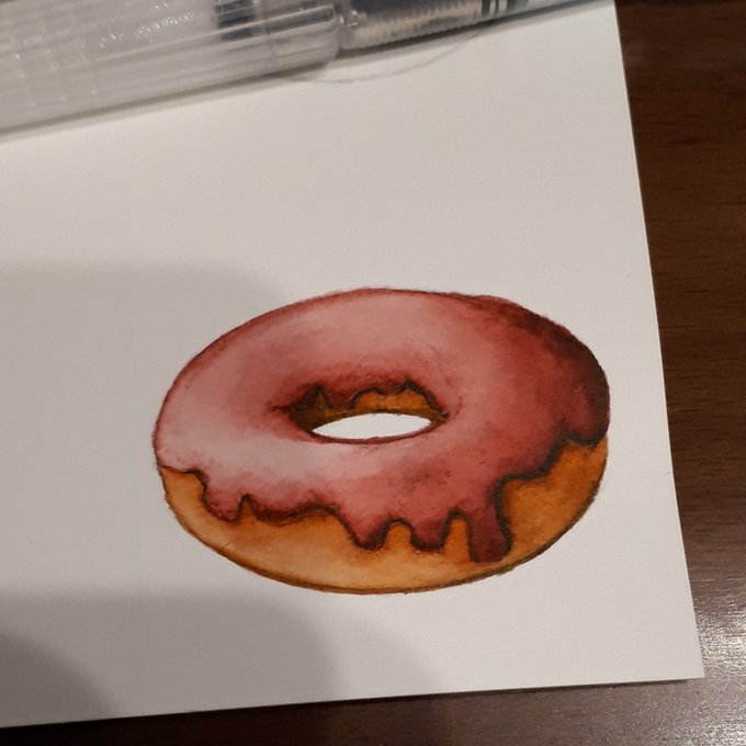 暗いというか黒い? 水彩ペン+水筆でドーナツ 最初間違えて暗い色使って気付いてあわあわしたけど、間違えなくてもこんな感じになる気がする 透明水彩でもやってみる #水彩