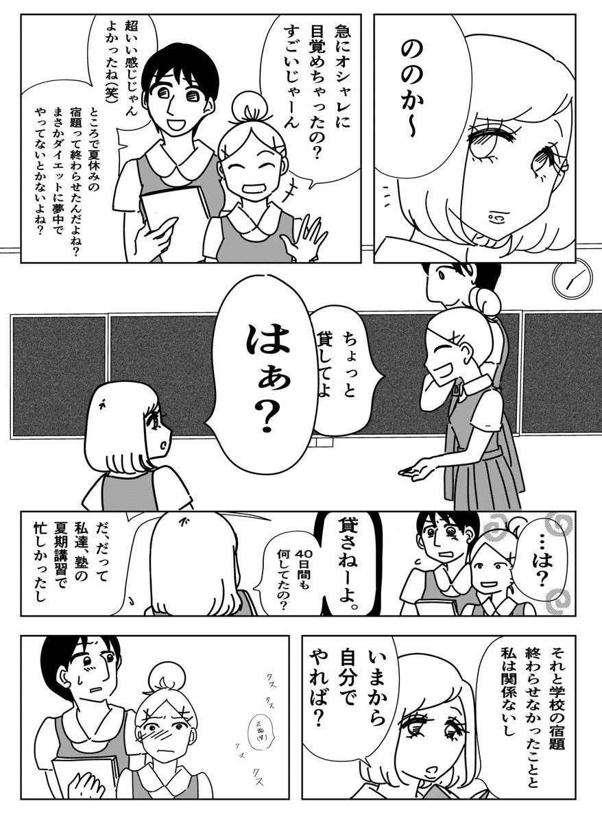 題名:ののかちゃん、いい子やめます。⑥ ののかを『都合の』いい子として扱ってきた同級生。 いい子をやめたののかを認められない彼女たちは、ののかを貶めようとするのですが‥ #週刊マンガ専科 #漫画が読めるハッシュタグ #漫画がよめるハッシュタグ #コルクラボマンガ専科 #鈴木はぐ