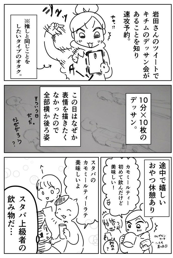 キチムのデッサン会に参加しました。はるむすびさんと岩田すずさんも一緒‼️ モデルさんが衣装を変え色んなポーズをとってくれて普段描かない態勢も描けた。途中休憩でおやつがでて皆とおしゃべりも出来てとっても有意義な時間でした💛ありがとうございました☺️✨ #漫画が読めるハッシュタグ #デッサン