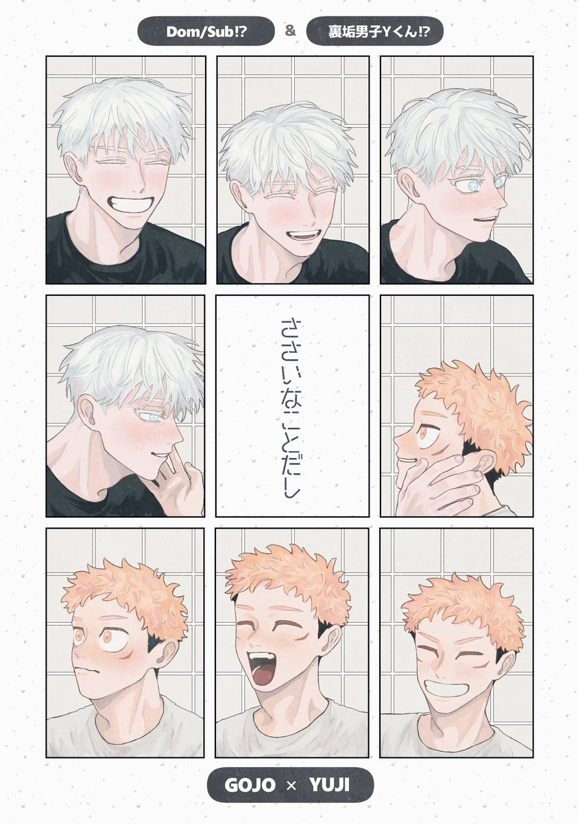 8/20 夏インテの五悠新刊サンプルです‼️ 「ささいなことだし」 A5 / 28P / 全年齢 ⚠️Dom/Sub(?)裏垢(?)あります 支部▶️ pixiv.net/artworks/11065… Dom/Subしたり(しない)(する)ゆうじくんに裏垢があったり(ない)(ある)する元気な五悠です!よろしくお願いします!(1/3)