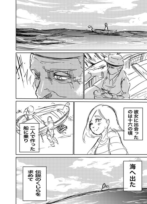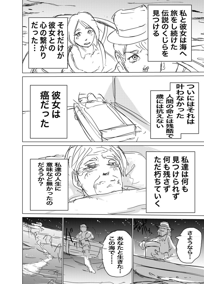 2 29 一つのお題からそれぞれが4pで漫画を描くのを友達とやって 今回は「伝説のクジラ」がお題で自分が描いたやつです 4pで漫画を描くの初めて〜 22/08/04 22:24
