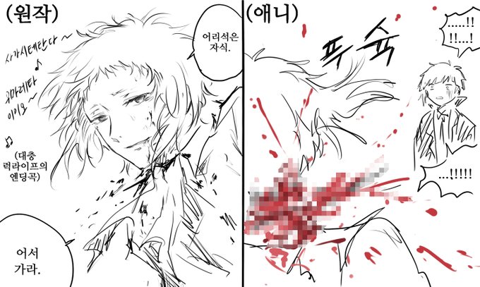 원작에선 그래도 k-드라마처럼 아련하고 낭만있게 쓰러지는데 애니는 자비없이 고어물찍어버리네