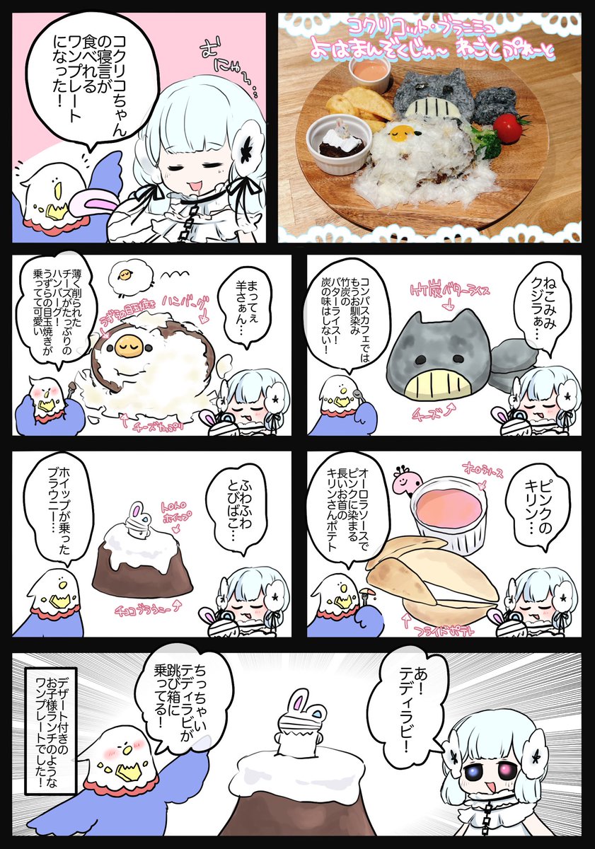 【コンパスカフェ グランドメニュー】 コクリコの よはまんぞくじゃ~ ねごとぷれーと 食べてきた日記! 4種類の寝言が食べれる(?!)かわいいやつ。羊さんのふわふわが、チーズのかつお節みたいな不思議な食材で美味しかった 6月末までのメニューです。