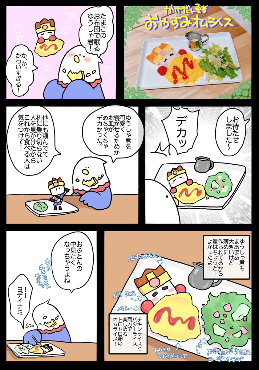 【コンパスカフェ グランドメニュー】 かけだし勇者 おやすみオムライス 食べてきた日記! 運ばれてきたお皿が大きくてビックリした、そんなデカ皿を何枚も配膳してた店員さんにもビックリした。 可愛くてスプーンを入れるのに戸惑うトロトロオムライス🫶 6月末までのメニューです