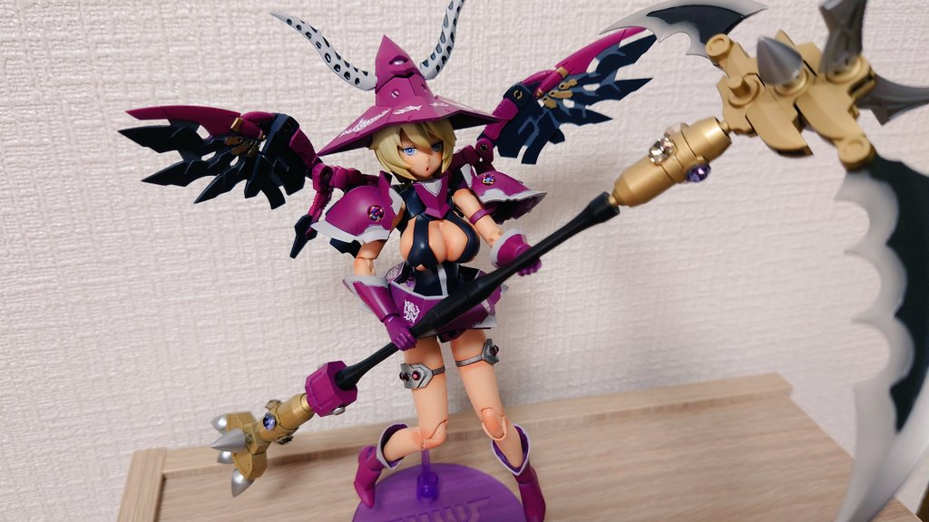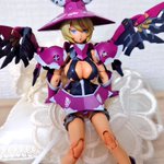 ウィッチ完成。 手芸屋で宝飾品選ぶのが一番しんどいポイントでしたが、その分肩アーマーの見栄えには満足。 スニークサイトから毟り取った羽根は良い感じだけども、鎌でかくて写真が撮りづらくなってしまった… #メガミデバイス