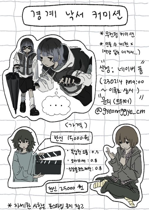 RT💙 14일 오후 9시부터 상시로 커미션을 받습니다. 자세한 사항은 공지를 참고해주세요. 공지: posty.pe/h07nvh 신청 폼: naver.me/58FMU3in 감사합니다!