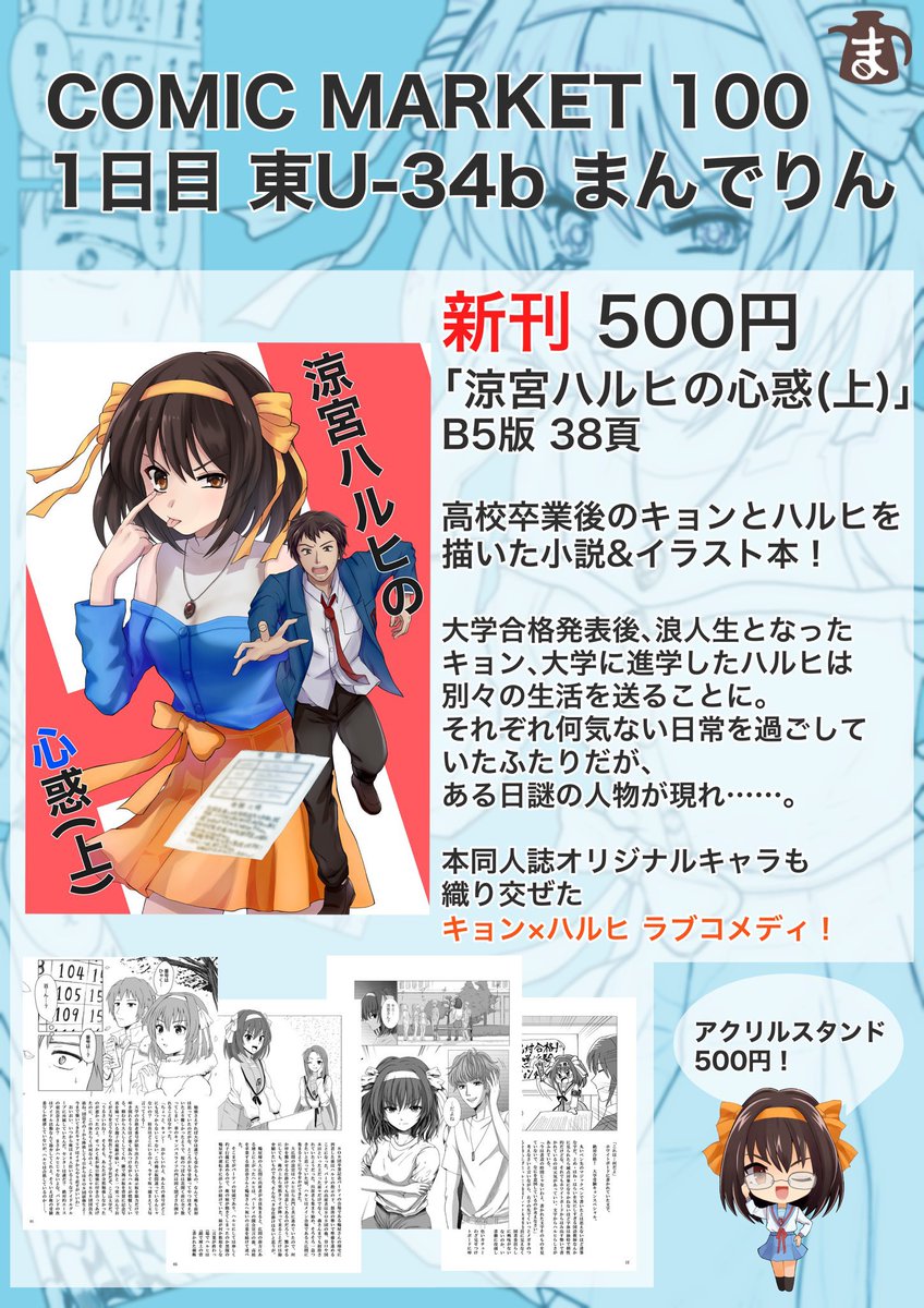 【8/13(土) COMIC MARKET100 1日目】 高校卒業後キョン×ハルヒの小説&イラスト本出します!よろしくお願いします! 小説:九十九 蒼 @Aoi_tsuku イラスト:ぐりら @gyud0nm0rim0ri 【サークル名:まんでりん 東U-34b】 #C100 #C100新刊 #C100お品書き #キョンハル #コミケ100 #コミックマーケット100