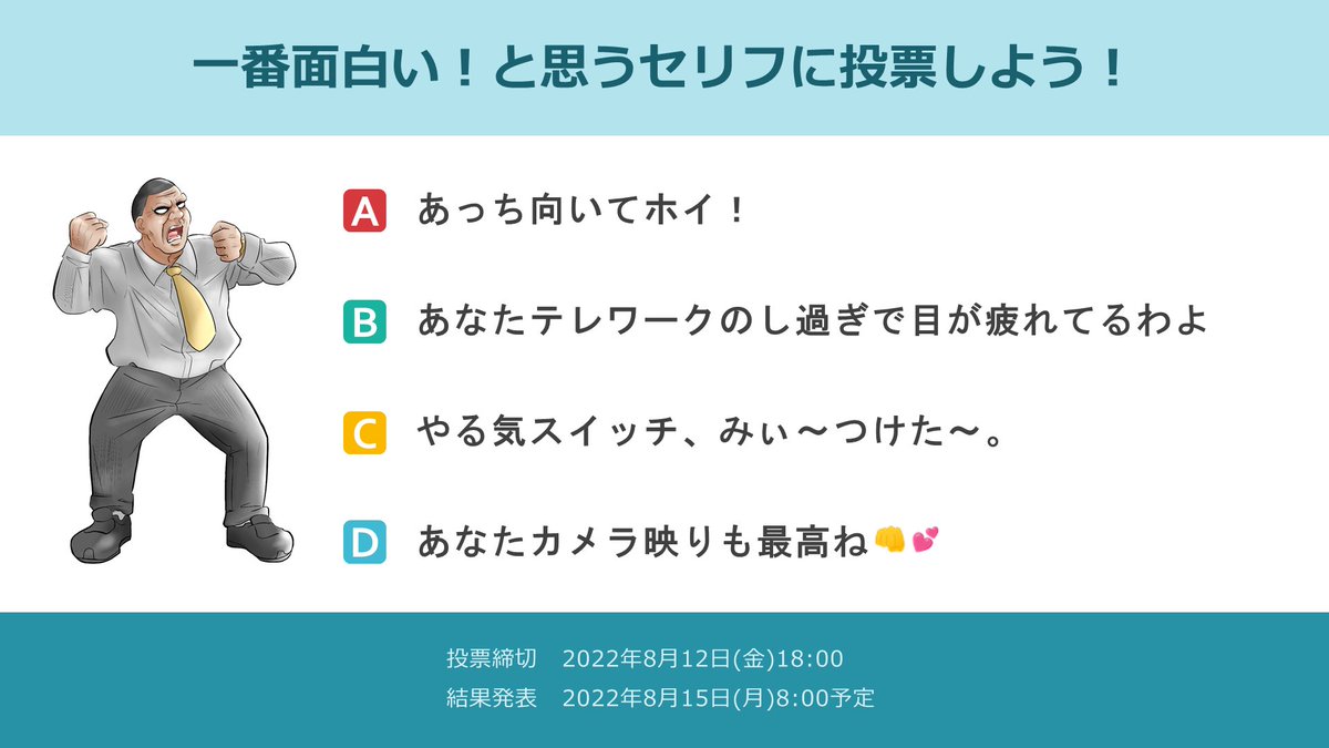 / #野村のシェアオフィス H¹T オリジナル漫画第5話 大喜利キャンペーン \ 空欄に入るセリフは? ⬇気に入ったものに投票してください! 多くの応募ツイートありがとうございました。 秀逸作品4選から、皆さんの投票で優勝を決めましょう✨ 詳しくは画像をチェック! #漫画が読めるハッシュタグ