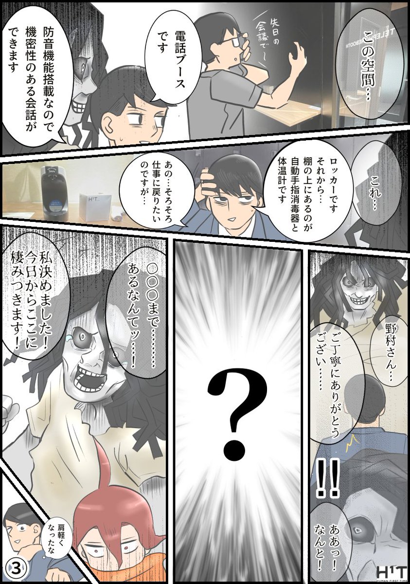 / #野村のシェアオフィス #H1T漫画 第13話 \ 人事部の会議中、課長がいつもと違う妙な動きを見せます。 その理由とは…?🤔 重要機密を扱うWEB会議に参加する必要がある… そんなとき、ぜひH¹Tの個室をご利用ください!💡 #漫画が読めるハッシュタグ #創作漫画