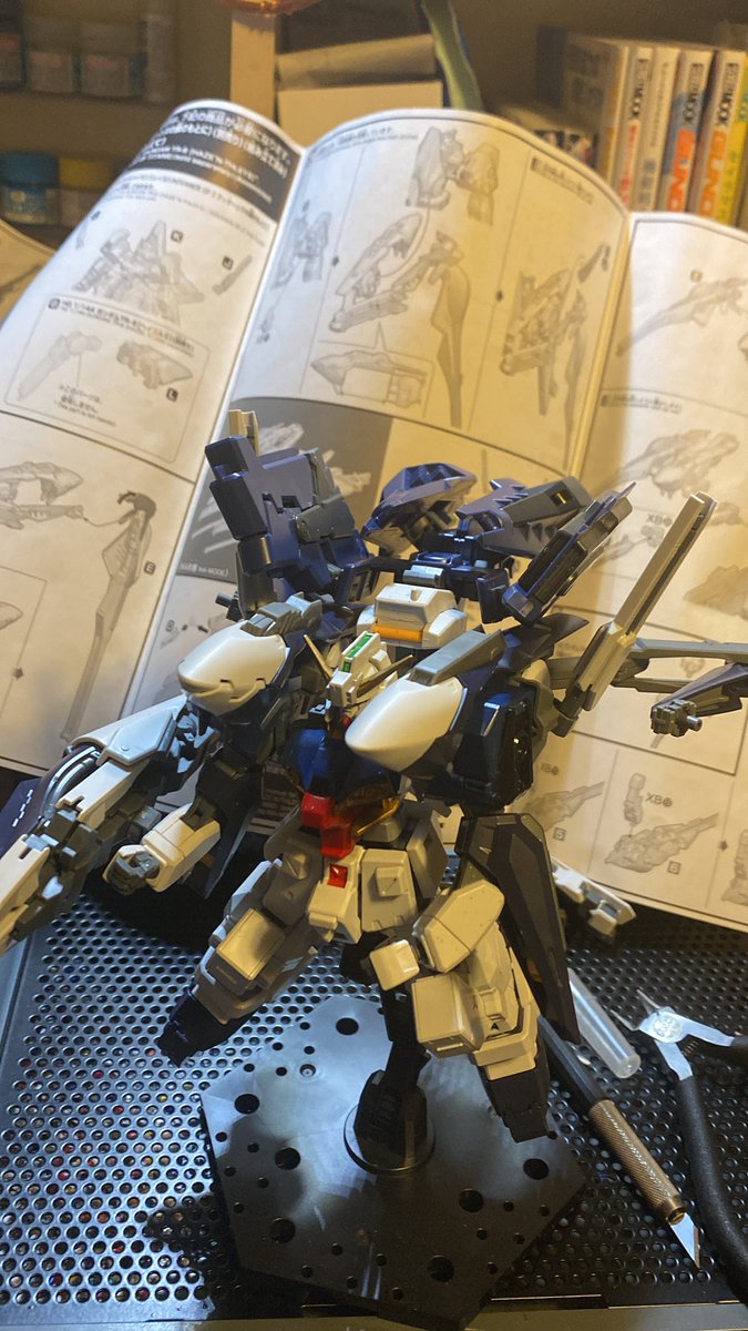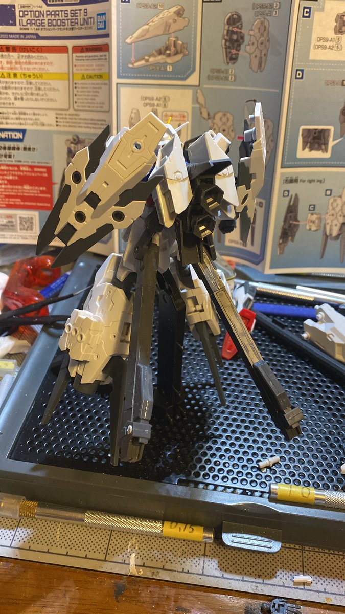現在までの進捗 腹部の隙間が気になり、プラ板で延長、背面はオプションラッチを取り付ける事で多種多様な武器やブースターを取り付ける事が可能になりました #ガンプラ改造 #ガンプラの画像貼るとRTされると聞いて #ガンプラは自由だ