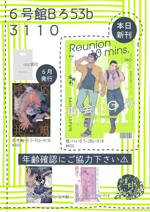 5/28黄金暗号22 2号館A23b 【3110】 お品書きです。新しいものは無いですが無配色々作ったので貰いに来てくださると嬉しいです!鯉月芸能アンソロジー(#kitkshow)の最高フライヤーも配布させていただいております。 よろしくお願いします!