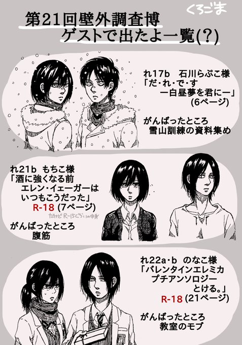 15 72 【お品書きではない】 謎の参加の仕方をしたので謎の一覧が出来ました。 こんな感じのエレミカで3冊出させて頂きました! もちこさんのところで売り子します! よろしくお願いします! 19/01/27 01:00
