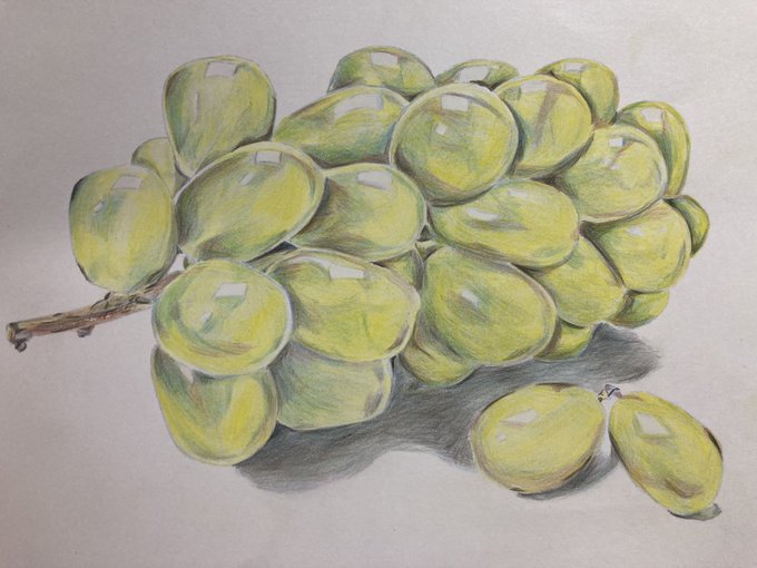 二枚目はシャインマスカット! 一粒一粒塗るの大変だった! 私ならすぐに黄緑色塗ってしまいそうだけど、青色の上に黄色塗るとちゃんとシャインマスカットの色になるのすごかった! #イロドリアル #色鉛筆画上達ドリル #色鉛筆