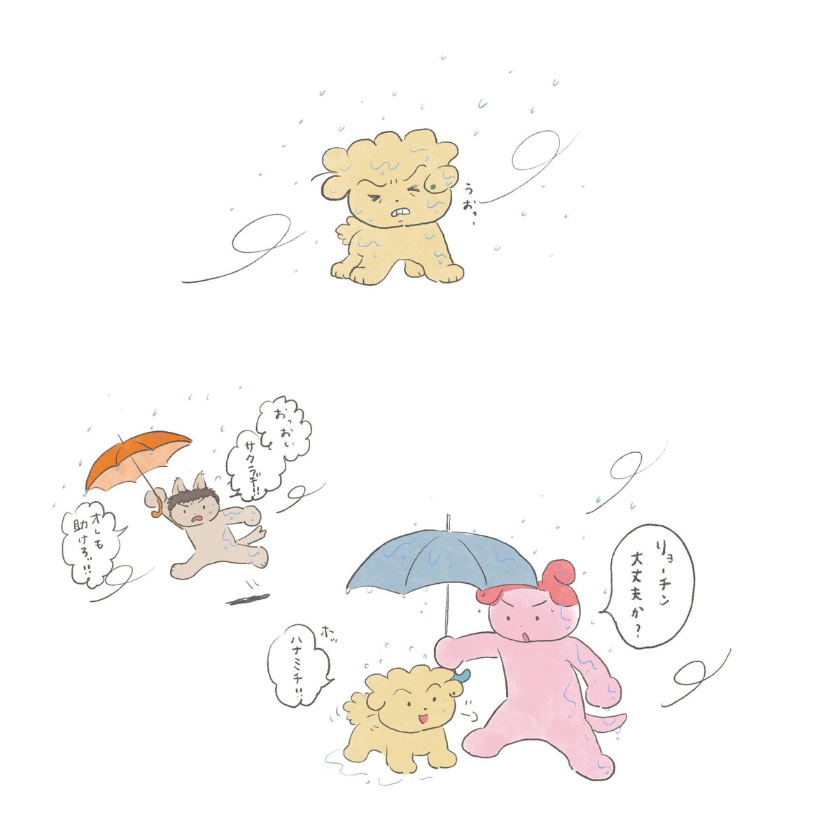 壁と屋根になってくれる大きな後輩☔️ 飛んでいっちゃう先輩☔️