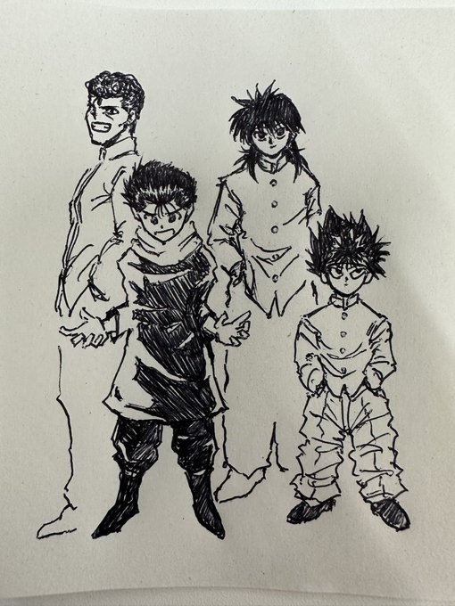 88 341 昔描いたやつを描き直した。 背景描き直すのは面倒だから当時のまま使ったw 幽助、桑原、蔵馬、飛影が仲良くお散歩 23/05/28 01:09