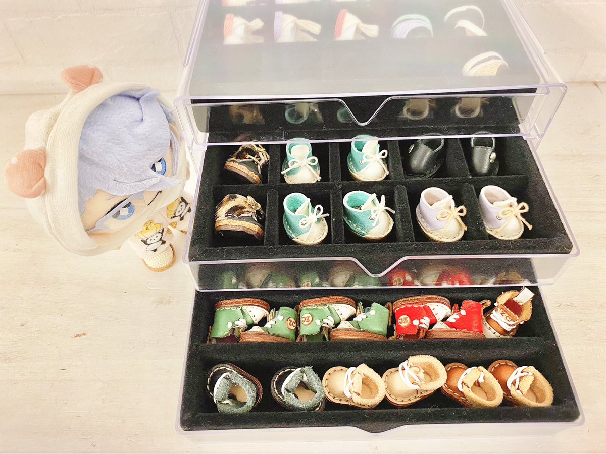 ぬいのお靴が増えてきて何かいいのないかな…と思ってたんですけど、ダ○ソーのアクセサリートレイとクリアケースの組み合わせが個人的に凄く良かったのでおすすめです!お靴沢山増えても積み重なるのでどんどん増やせる!!
