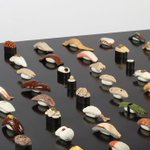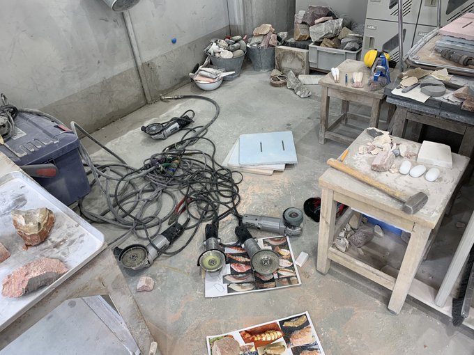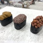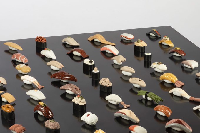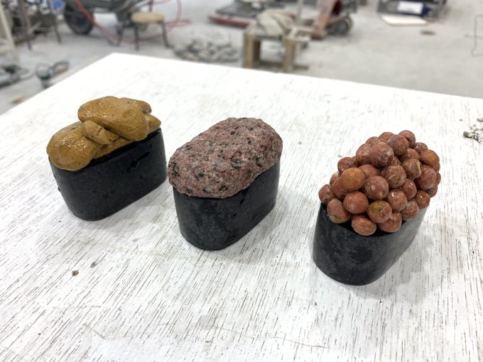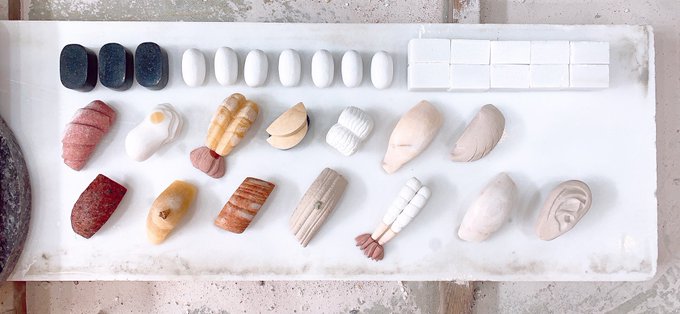 五美大展このご時世なかなか来れないと思うのでここで見て貰えたら嬉しい、、コロナで前期リモートの中後期にせっせと頑張って彫った卒制の石以外何も使ってない着色料無使用の天然石寿司 全部石です。