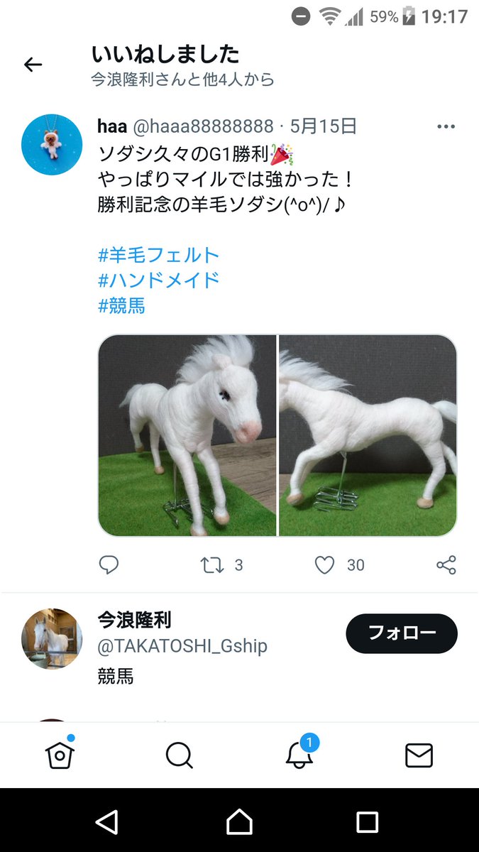 0 9 自分が作ったソダシちゃん人形にまさかあの今浪隆利さんからイイネがもらえるとは…これは嬉しすぎるΣ(Д゚;/)/ビックリ ありがとうございますm(_ _)mペコリ #羊毛フェルト #ハンドメイド 22/05/17 19:31