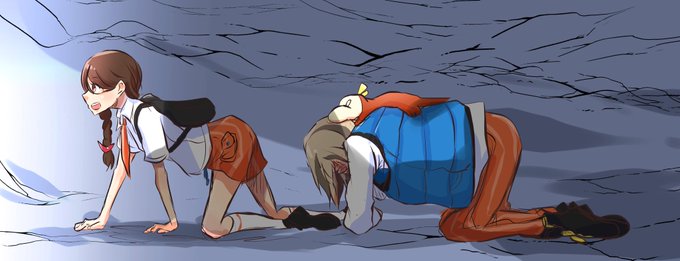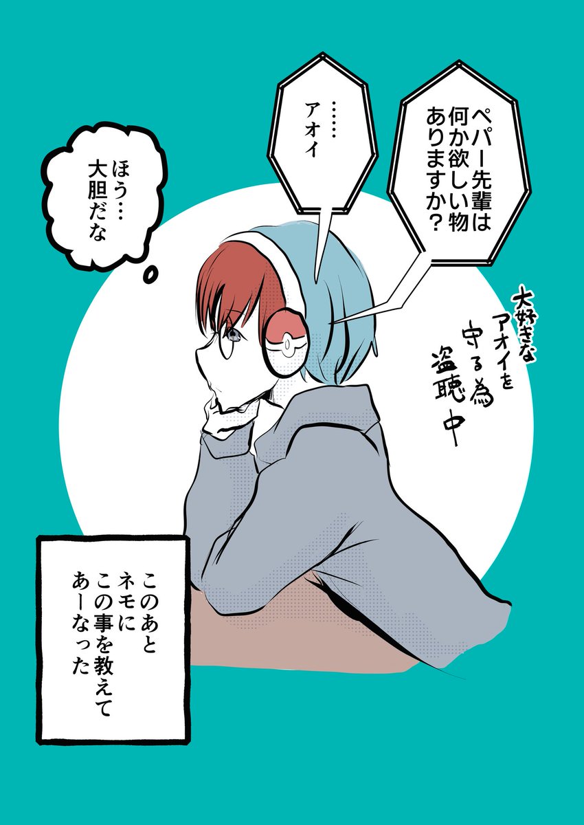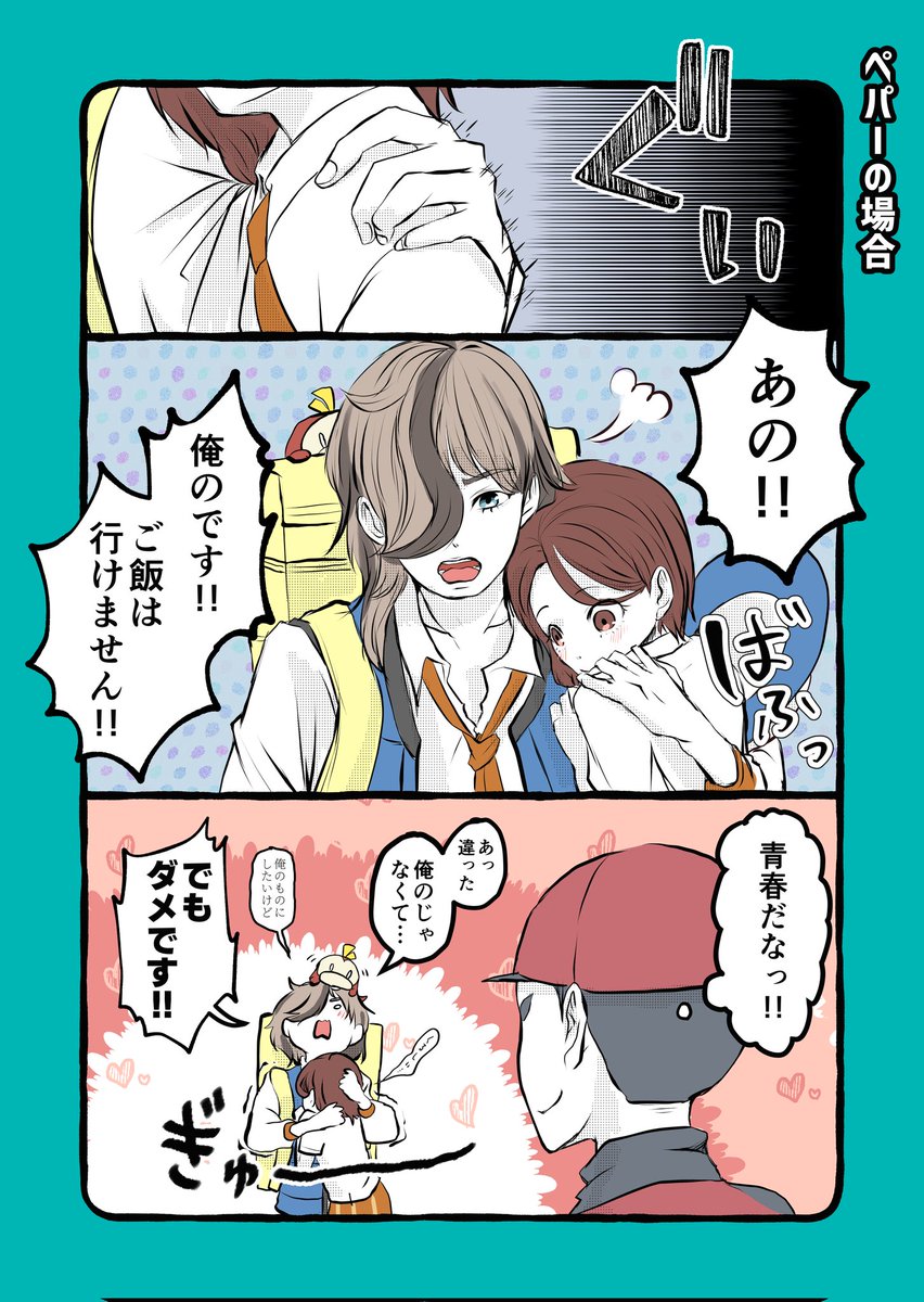 67 702 ペパアオ連投祭り スパイスまでの道が狭くて張って進んでいた2人だが ふとペパー先輩がオアイちゃんを女と意識してしまって 照れてあら大変な絵 22/11/25 15:09