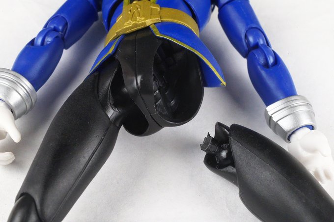 真骨彫ゴーカイレッドのレビューでブルーも使おうと思って、少し動かしたらいきなり股関節がぽっきり どうやら関節が癒着してた模様 古いフィギュアを久しぶりに動かす時は気を付けないと…