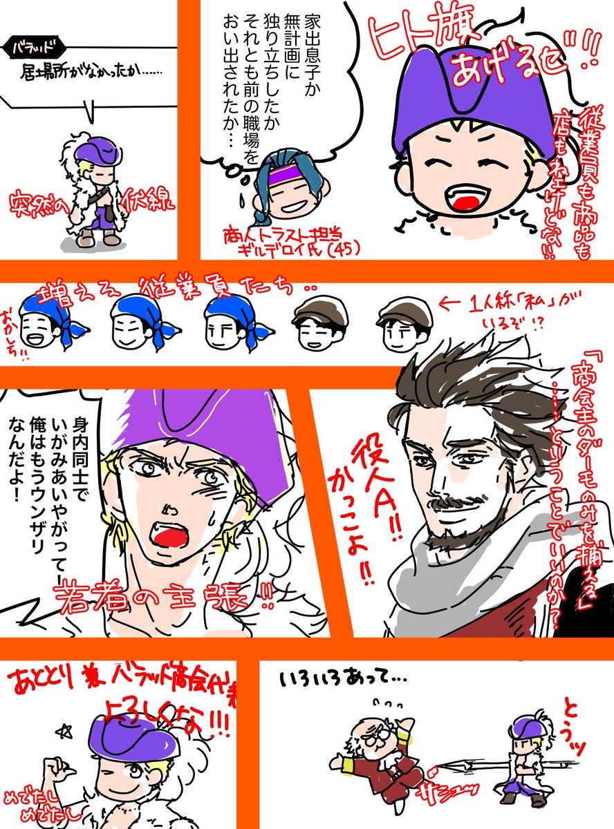「タイタス」 リクありがとうございました! 若タイでもなうタイでもOKということでしたので赴任して苦虫潰しながらも着々と力をつける30代を考えました。いつかタイタス対クレス描きたいな…。 #旅人の手記ONLINE3_エアスケブ