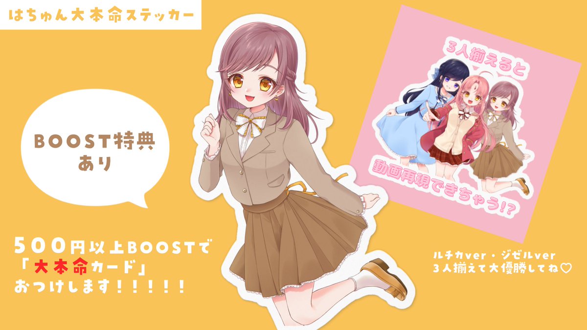 \バレンタイン記念グッズ出たよ🍫💘/ 各BOOTHにて「大本命ステッカー」を期間限定販売! (2月末までの販売予定) はちゅんverはBOOST特典あるよ~ん💘 ❤ルチカ大本命ver. lull-luzyca.booth.pm/items/4524526 💙ジゼル大本命ver. gisellequin.booth.pm/items/4530358 💛はちゅん大本命ver. hachun.booth.pm/items/4525904